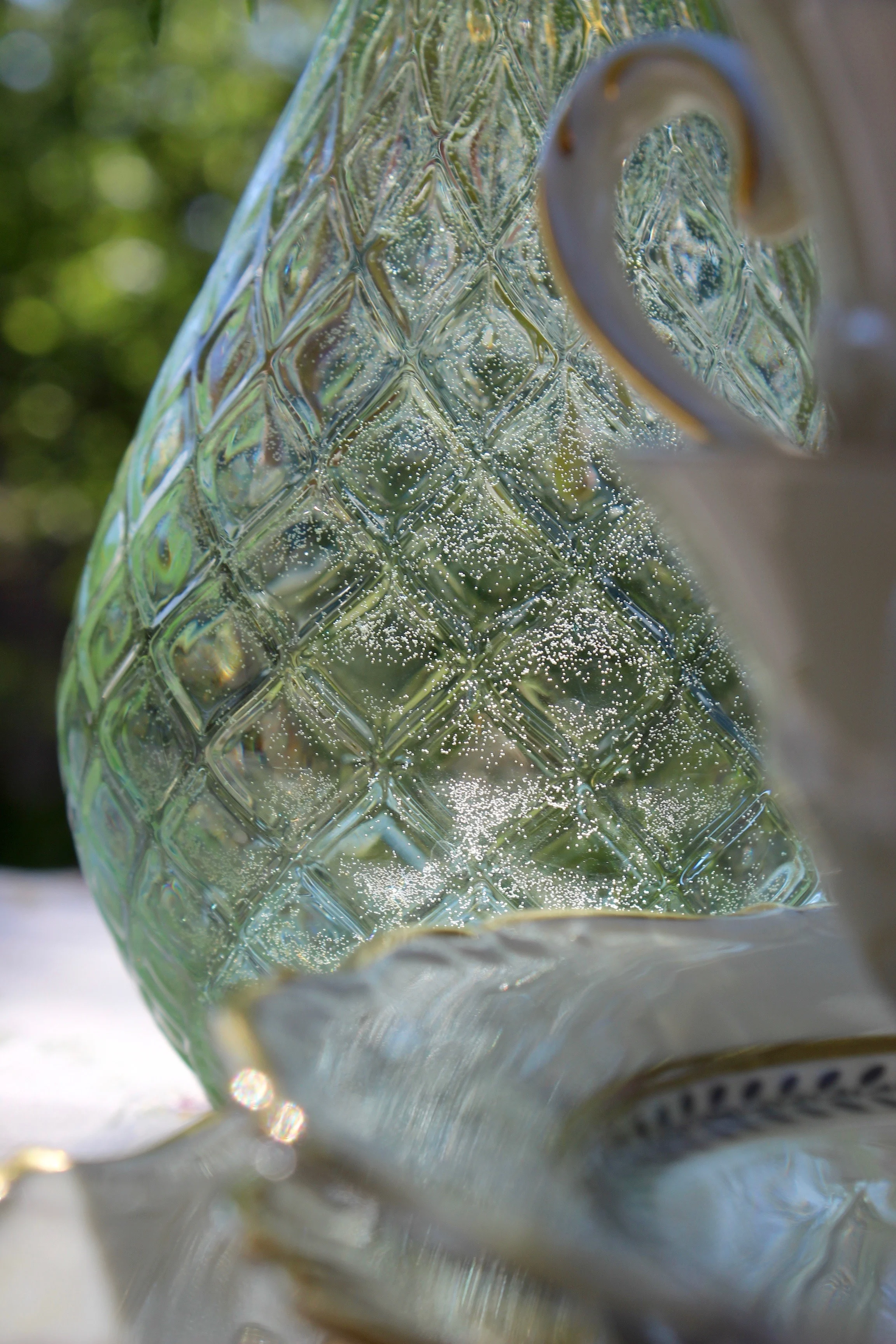On a Swedish tea set from early 1900s and an embroidered tablecloth.